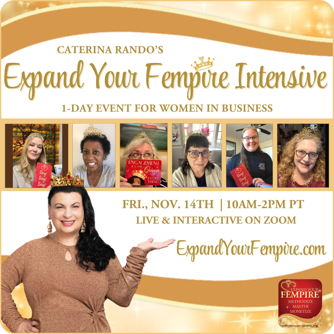 Join Caterina Rando for the Expand Your Fempire Intensive — a one-day, live, virtual event designed to help you scale your business with strategy, confidence, and community.