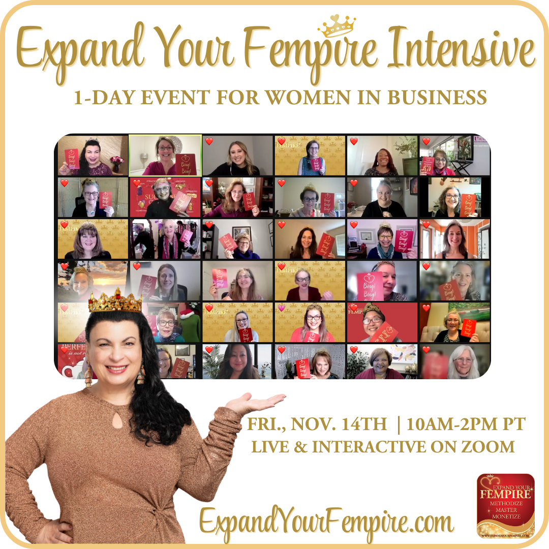 I would greatly appreciate your support in sharing the Expand Your Fempire One-Day Intensive with other women in business who you think are a good match for our community. I encourage you to use some of the fun graphics below to post on social media (please tag me!). Also, see the done-for-you email content written below to send to your list.